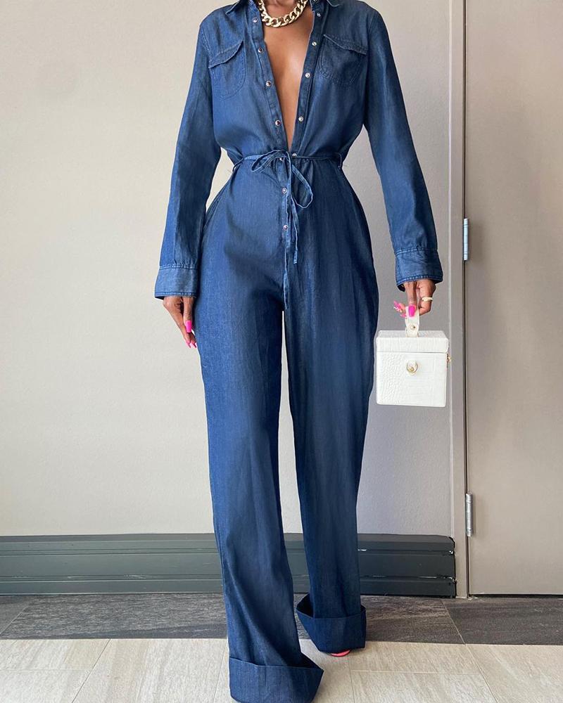 Style:Casual Type:Jumpsuit Material:Polyester Neckline:Turn-down Collar Sleeve Style:Long Sleeve Length:Long Pattern Type:Plain Decoration:Pocket,Button Fit Type:Regular With Belt:Yes Occasion:Daily Package Include:1*Jumpsuit (With Belt)