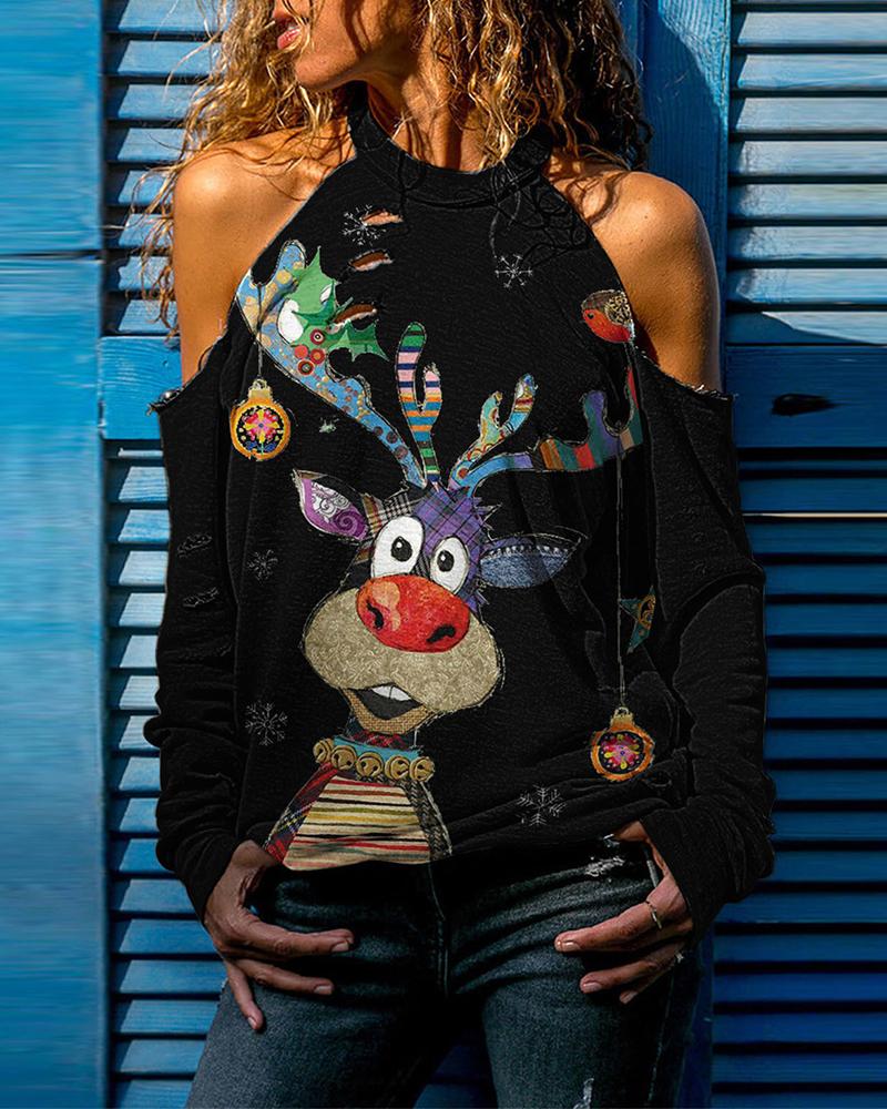 Style:Chic Type:Tee Material:Polyester Neckline:Cold Shoulder Sleeve Style:Long Sleeve Length:Regular Pattern Type:Cartoon,Christmas,Graphic,Letter Decoration:Cutout Fit Type:Regular Occasion:Christmas Package Include:1*Top