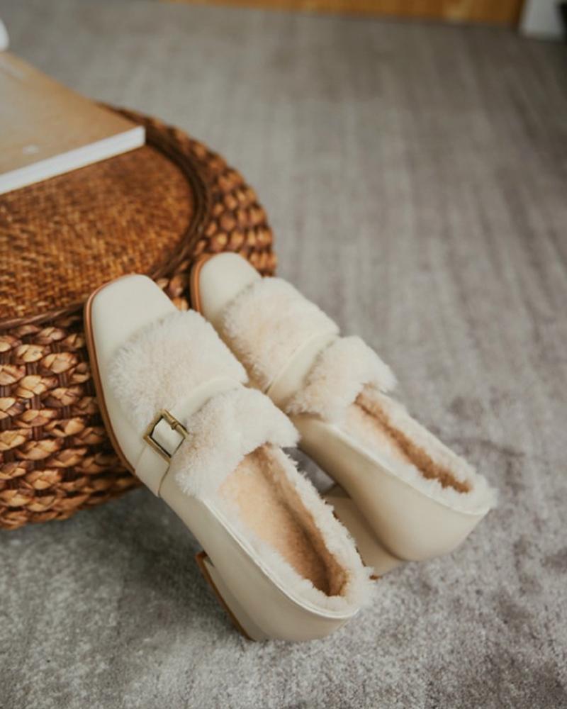 Fluffy Decor Buckled Square Toe Chunky Loafers