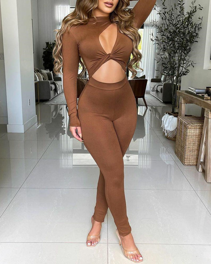 Style:Chic Type:Jumpsuit Material:Polyester Neckline:O-neck Sleeve Style:Long Sleeve Length:Long Pattern Type:Plain Decoration:Cutout,Twist Fit Type:Skinny Occasion:Daily Package Include:1*Jumpsuit