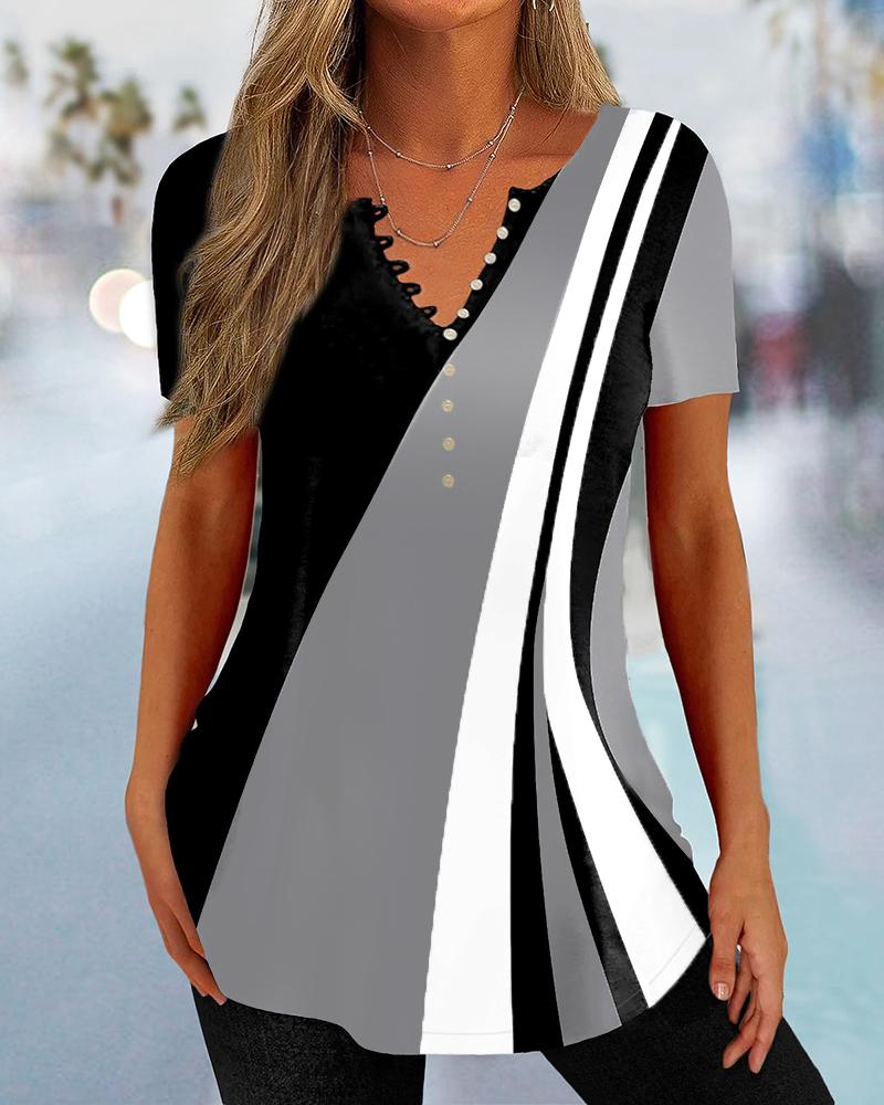 Style:Casual Type:Tee Material:Polyester Neckline:Round Neck Sleeve Style:Short Sleeve Length:Regular Pattern Type:Abstract,Colorblock Decoration:Button Fit Type:Regular Occasion:Daily Package Include:1*Top Fabric Elasticity:Slight Stretch Sheer:No Care Instructions:Machine wash or professional dry clean