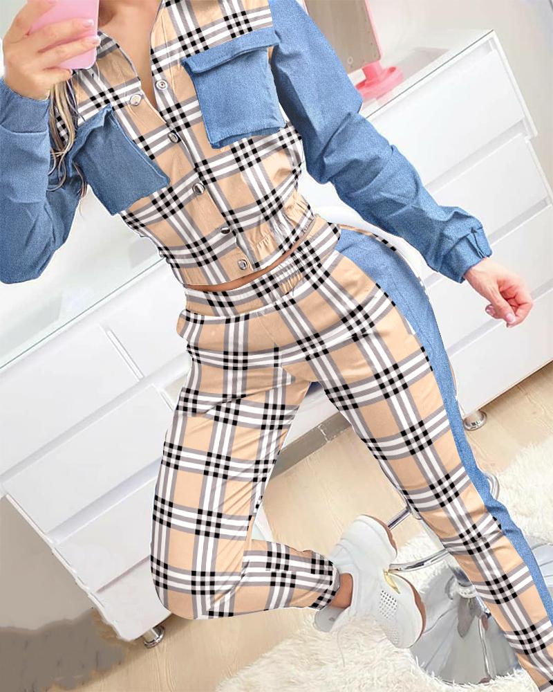 Plaid Print Patchwork Buttoned Shirt & High Waist Pants Set