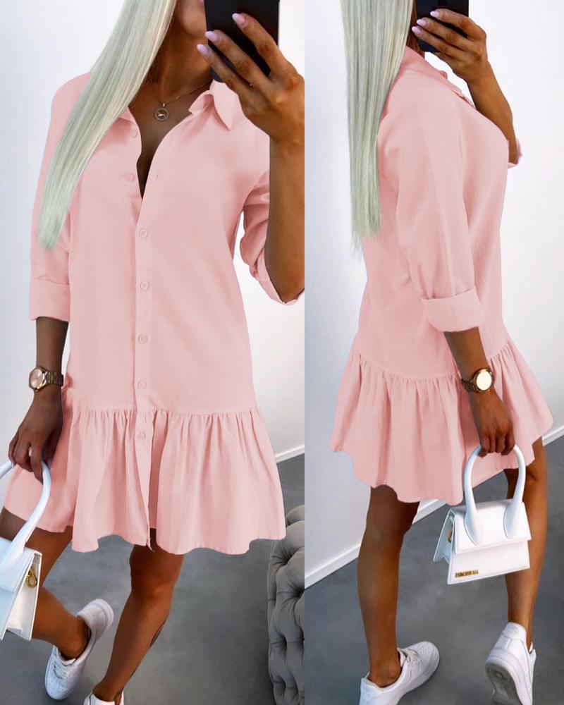 Style:Chic Type:A Line Material:100%Polyester Neckline:Turn-down Collar Sleeve Style:Long Sleeve Length:Mini Pattern Type:Plain Decoration:Button,Ruffles Fit Type:Regular Occasion:Daily Package Include:1* Dress Fabric Elasticity:Slight Stretch Sheer:No Care Instructions:Machine wash or professional dry clean