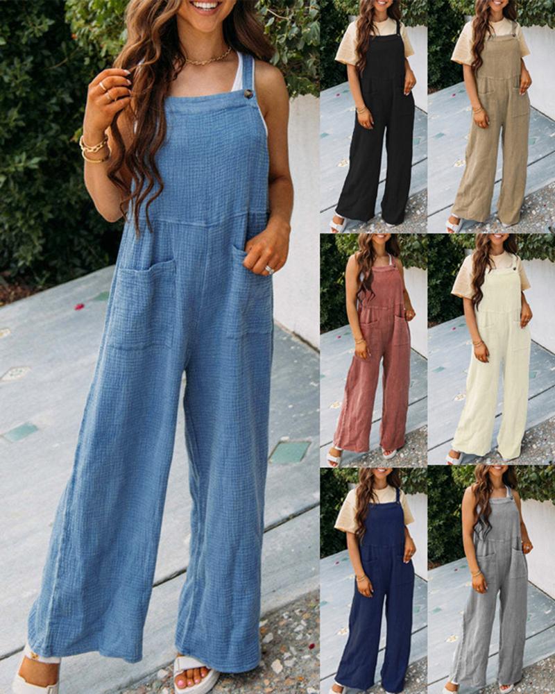 Style:Casual Type:Jumpsuit Material:Waffle Knit Neckline:Square Neck Sleeve Style:Sleeveless Length:Long Pattern Type:Plain Decoration:Pocket Fit Type:Regular Occasion:Daily Package Include:1*Jumpsuit Fabric Elasticity:Slight Stretch Sheer:No Care Instructions:Machine wash or professional dry clean