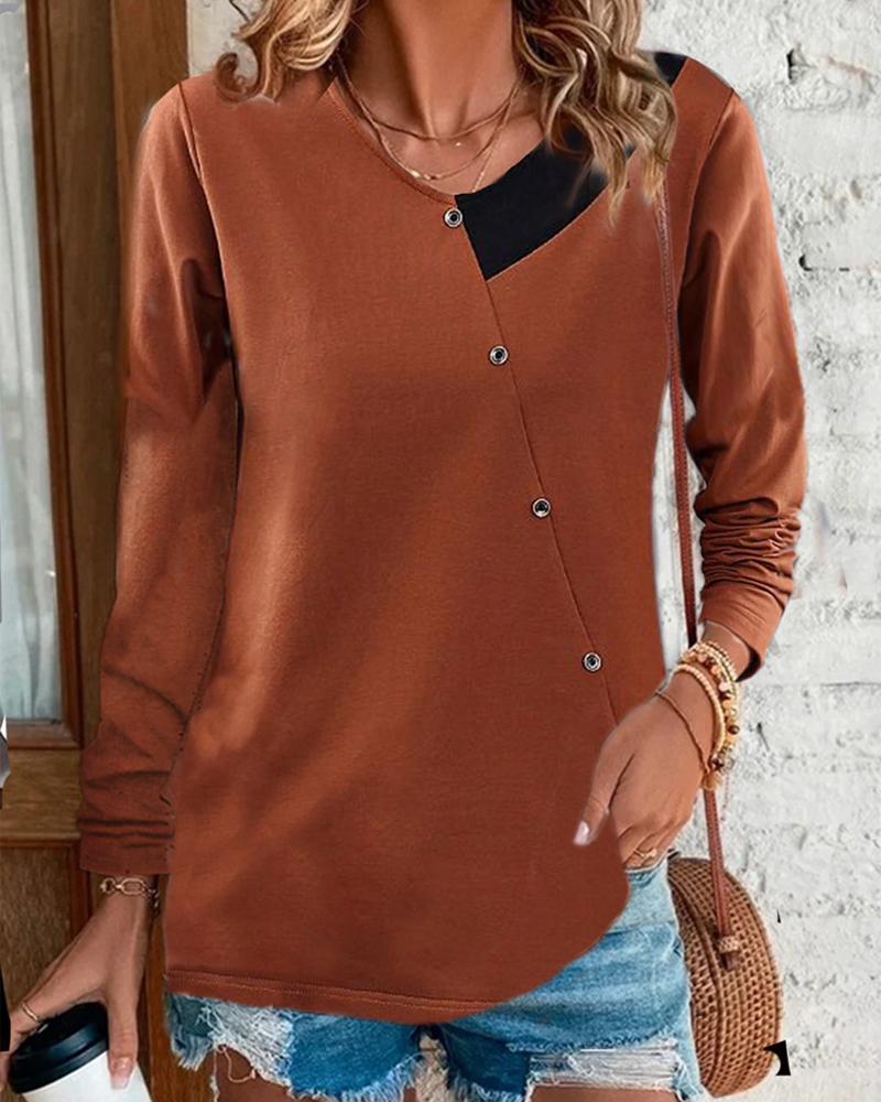 Style:Casual Type:Tee Material:100%Polyester Neckline:V-Neck Sleeve Style:Long Sleeve Length:Regular Pattern Type:Colorblock Decoration:Button Fit Type:Regular Occasion:Daily Package Include:1*Top Fabric Elasticity:Slight Stretch Sheer:No Care Instructions:Machine wash or professional dry clean