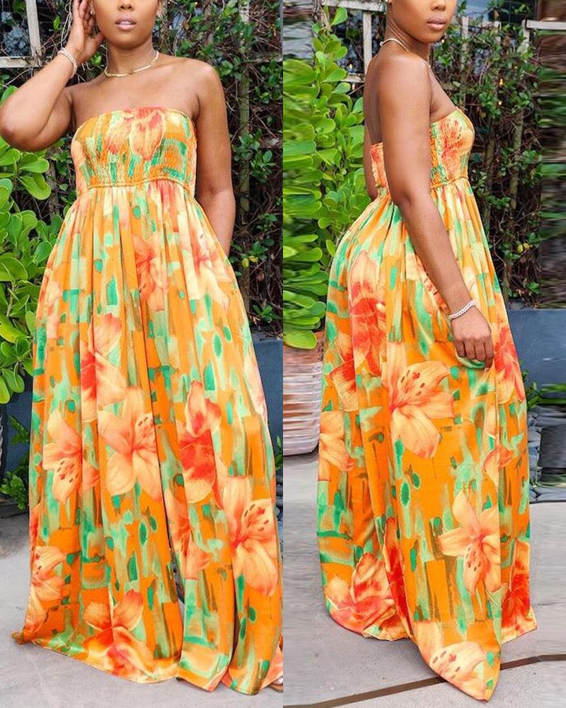 Style:Chic Type:Jumpsuit Material:Polyester Neckline:Bandeau Sleeve Style:Sleeveless Length:Maxi Pattern Type:Floral Decoration:Shirred Fit Type:Regular Occasion:Daily Package Include:1*Jumpsuit Fabric Elasticity:Slight Stretch Sheer:No Care Instructions:Machine wash or professional dry clean