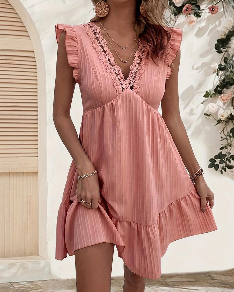 Style:Chic Type:A Line Material:100%Polyester Neckline:V-Neck Sleeve Style:Short Sleeve Length:Midi Pattern Type:Plain Decoration:Contrast Lace,Ruffles Fit Type:Regular Occasion:Daily Package Include:1* Dress Fabric Elasticity:Slight Stretch Sleeve Type:Flutter Sleeve Sheer:No Care Instructions:Machine wash or professional dry clean