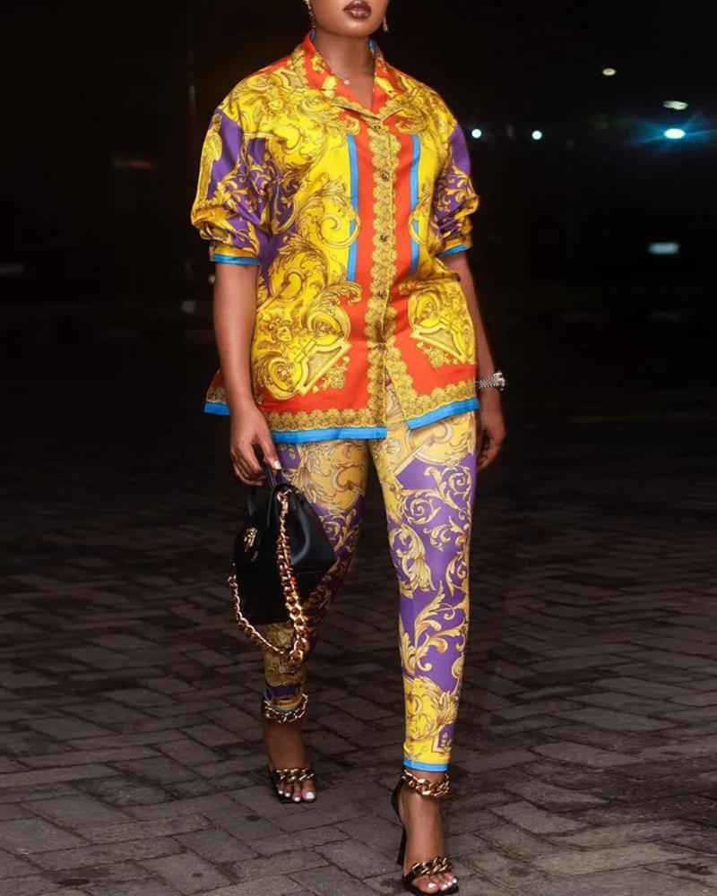 Style:Chic Type:Pants Sets Material:100%Polyester Neckline:Turn-down Collar Sleeve Style:Half Sleeve Length:Long Pattern Type:Baroque,Contrast Paneled Decoration:Button Fit Type:Regular Occasion:Daily Package Include:1*Pants Set Fabric Elasticity:Slight Stretch Sheer:No Care Instructions:Machine wash or professional dry clean