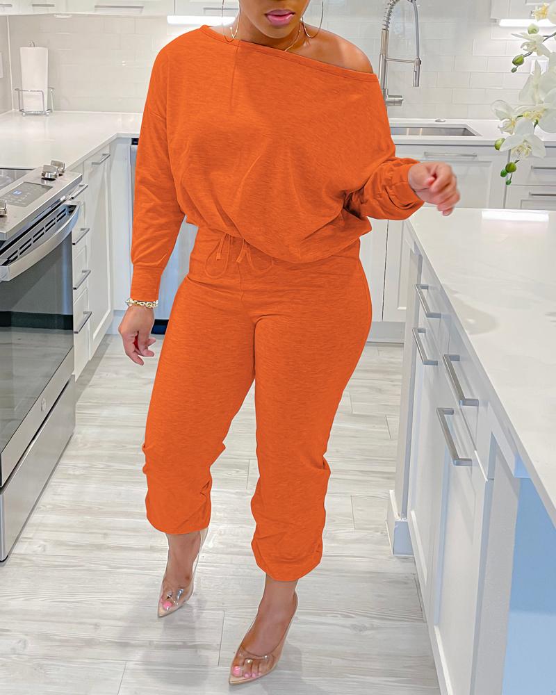Skew Neck Top & Drawstring Cuffed Pants Set