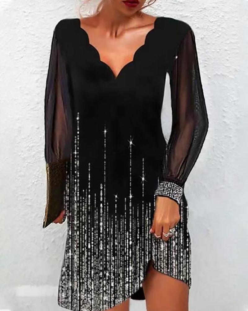 Style:Casual Type:Straight Material:100%Polyester Neckline:V-Neck Sleeve Style:Long Sleeve Length:Mini Pattern Type:Ombre Decoration:Rhinestone,Scallop,Sheer Mesh Fit Type:Regular Occasion:Daily Package Include:1* Dress Fabric Elasticity:Slight Stretch Sheer:Semi-Sheer Care Instructions:Machine wash or professional dry clean
