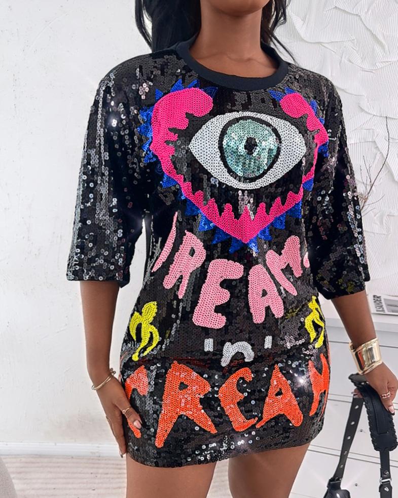Style:Chic Type:Tee Material:Polyester,Sequin Neckline:Round Neck Sleeve Style:Three Quarters Length:Long Pattern Type:Figure,Letter Decoration:Allover Sequin Fit Type:Regular Occasion:Daily,Night Out Package Include:1*T-Shirt Fabric Elasticity:Slight Stretch Sheer:No Care Instructions:Hand wash, do not dry clean