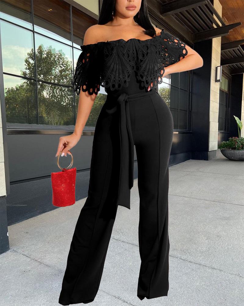 Style:Chic Type:Jumpsuit Material:Polyester Neckline:Off the Shoulder Sleeve Style:Short Sleeve Length:Long Pattern Type:Plain Decoration:Frill Hem,Hollow-out,Tied Detail Fit Type:Regular Occasion:Daily Package Include:1*Jumpsuit Fabric Elasticity:Non-Stretch Sheer:No Care Instructions:Hand wash, do not dry clean