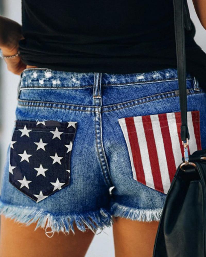 Independence Day Flag Print Ripped Raw Hem Denim Shorts
