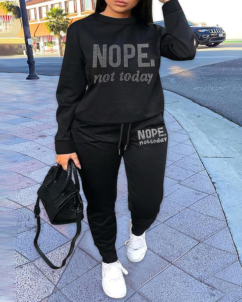 Plus Size Rhinestone Nope Not Today Pattern Sweatshirt & Drawstring Sweatpants Set