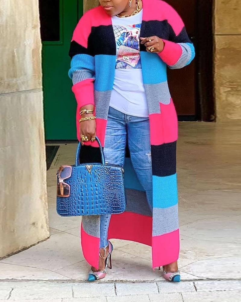 Plus Size Colorblock Striped Chunky Knit Longline Cardigan