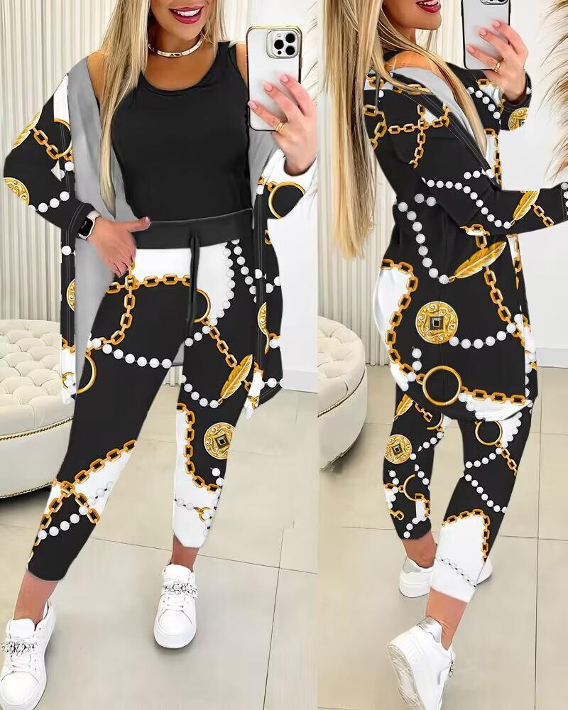 Tank Top & Chain Print Colorblock Drawstring Pants Set With Coat