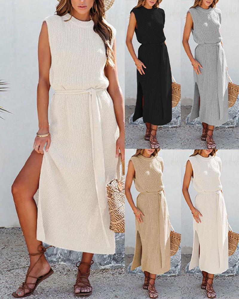 Style:Casual,Chic Type:Slit Material:97%Polyester,3%Spandex Neckline:Round Neck Sleeve Style:Sleeveless Length:Mid-Calf Pattern Type:Plain Decoration:Tied Detail Fit Type:Regular Occasion:Daily Package Include:1* Dress Fabric Elasticity:Slight Stretch Sheer:No Care Instructions:Hand wash or dry clean
