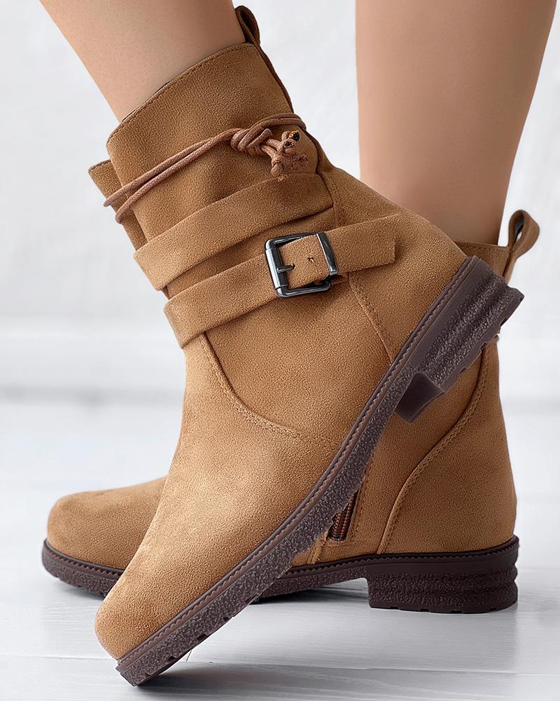 Tied Detail Side Zipper Buckled Ankle Boots