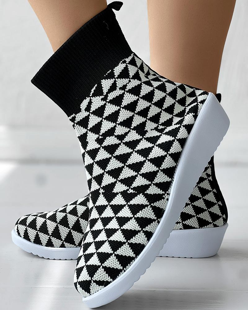 Geometric Pattern Colorblock Fly Knit Ankle Boots