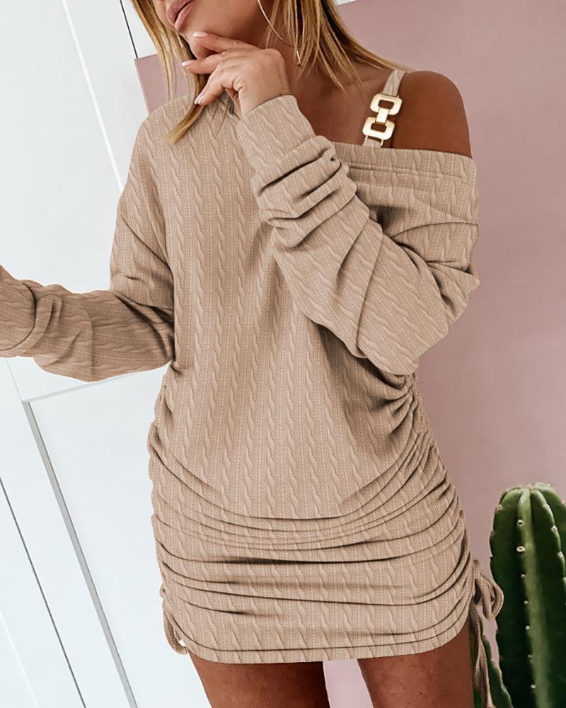 Style:Casual Type:Bodycon Material:95%Polyester,5%Elastane Neckline:Cold Shoulder Sleeve Style:Long Sleeve Length:Mini Pattern Type:Plain Decoration:Drawstring,Ruched,Chain Fit Type:Regular Occasion:Daily Package Include:1*Dress Fabric Elasticity:High Stretch Sheer:No Care Instructions:Machine wash or professional dry clean