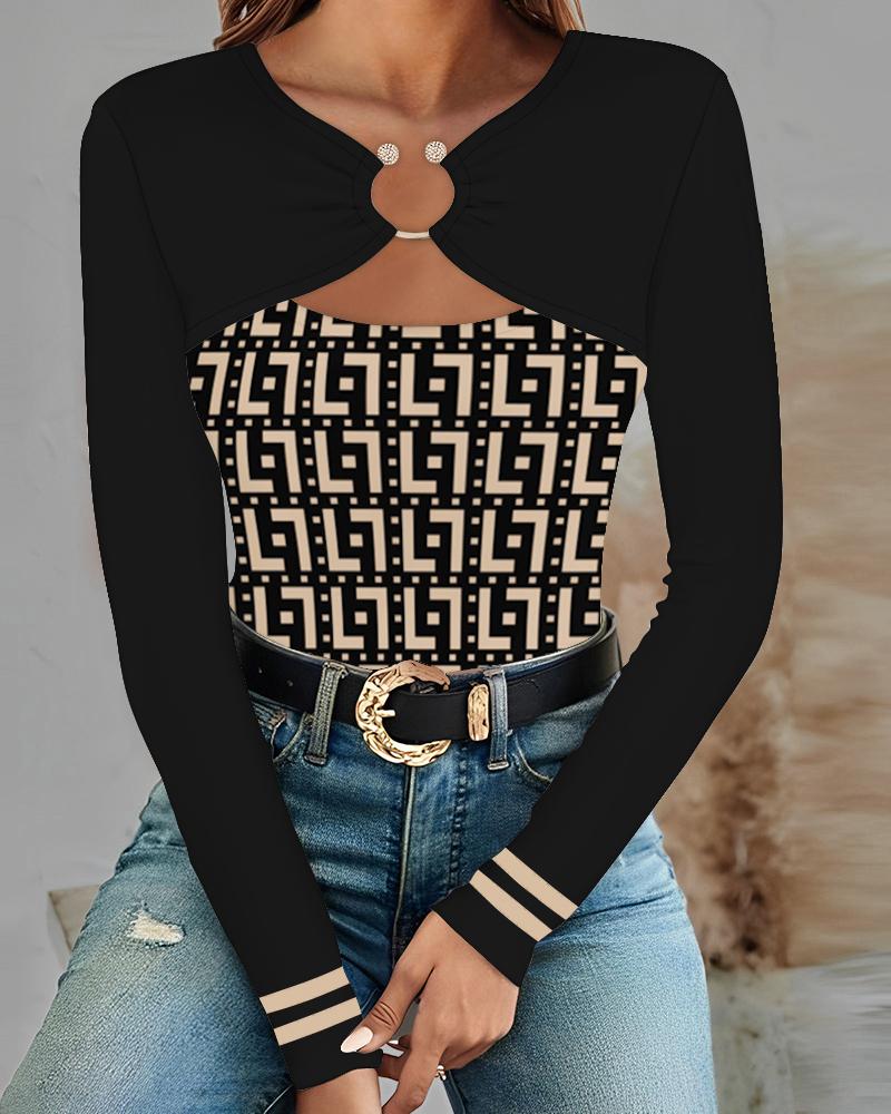 Style:Chic Type:Tee Material:94%Polyester,6%Elastane Neckline:Asymmetrical Neck Sleeve Style:Long Sleeve Length:Regular Pattern Type:Contrast Paneled,Geometric,Colorblock Decoration:Cutout Fit Type:Regular Occasion:Daily Package Include:1*Top Fabric Elasticity:Slight Stretch Sheer:No Care Instructions:Machine wash or professional dry clean