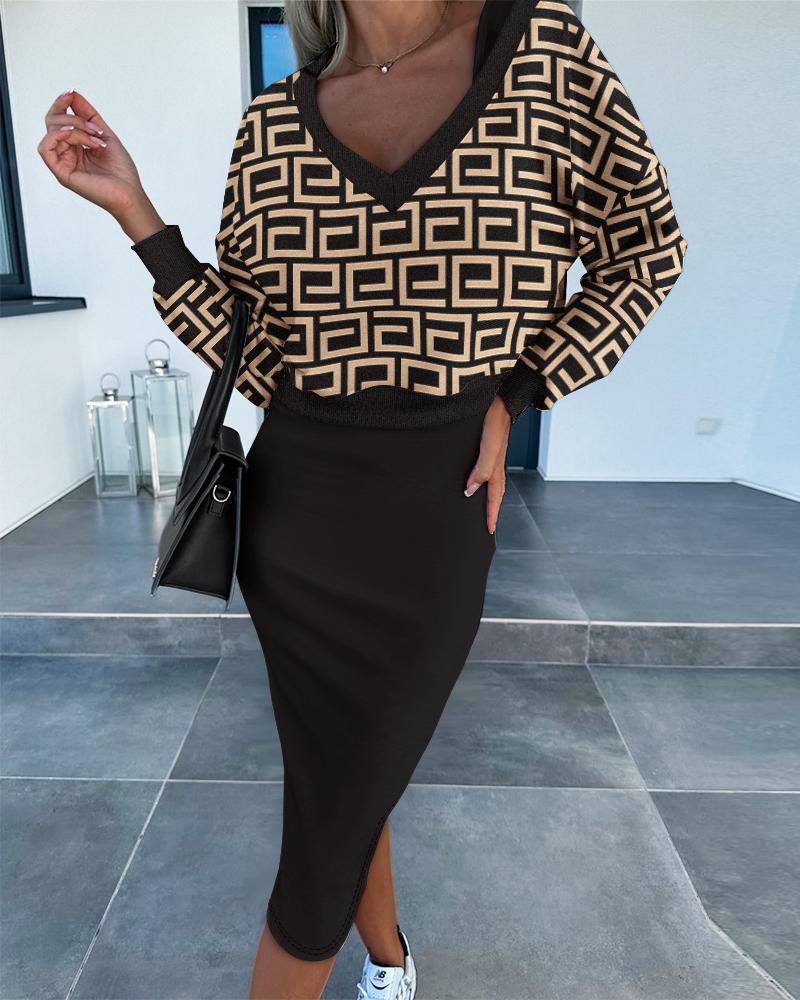 Style:Casual Type:Suit Set Material:95%Polyester,5%Elastane Neckline:V-Neck Sleeve Style:Long Sleeve,Sleeveless Length:Mid-Calf Pattern Type:Geometric Decoration:Others Fit Type:Regular Occasion:Daily Package Include:1*Top & Dress Set Fabric Elasticity:Medium Stretch Sheer:No Care Instructions:Machine wash or professional dry clean