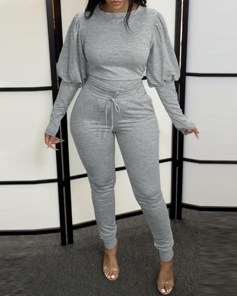 Round Neck Gigot Sleeve Top & Drawstring Pants Set