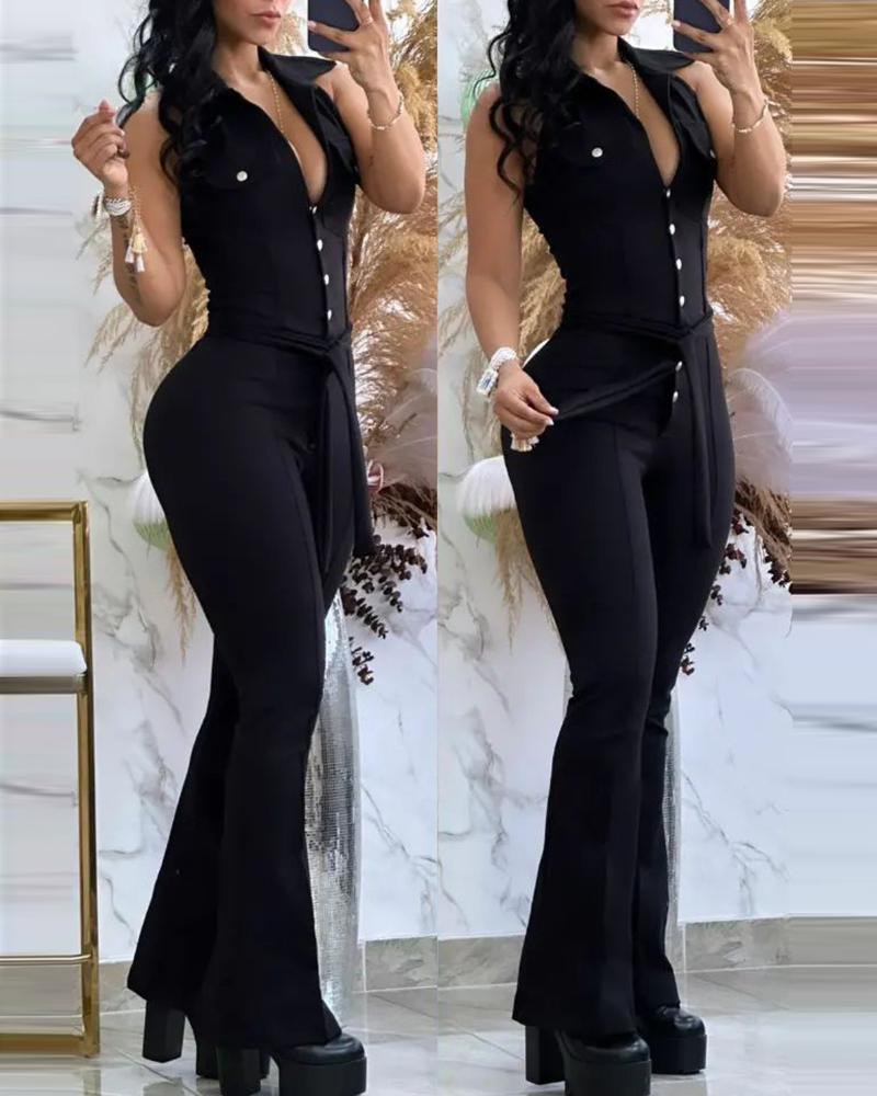 Style:Chic,Sexy Type:Jumpsuit Material:100%Polyester Neckline:Plunge,Turn-down Collar Sleeve Style:Sleeveless Length:Long Pattern Type:Plain Decoration:Button,Tied Detail Fit Type:Skinny Occasion:Daily Package Include:1*Jumpsuit Fabric Elasticity:Slight Stretch Sheer:No Care Instructions:Machine wash or professional dry clean
