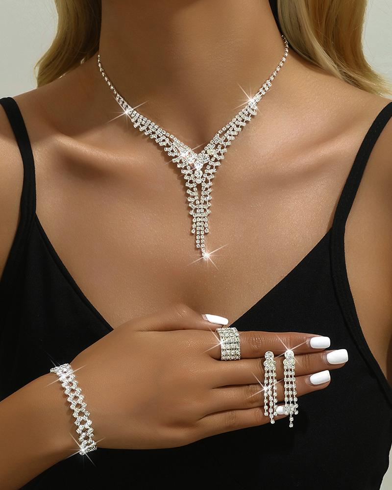 4PCS Tassel Design Hollow Out Rhinestone Pendent Necklace & Drop Earrings & Ring & Bracelet Wedding Jewelry Set