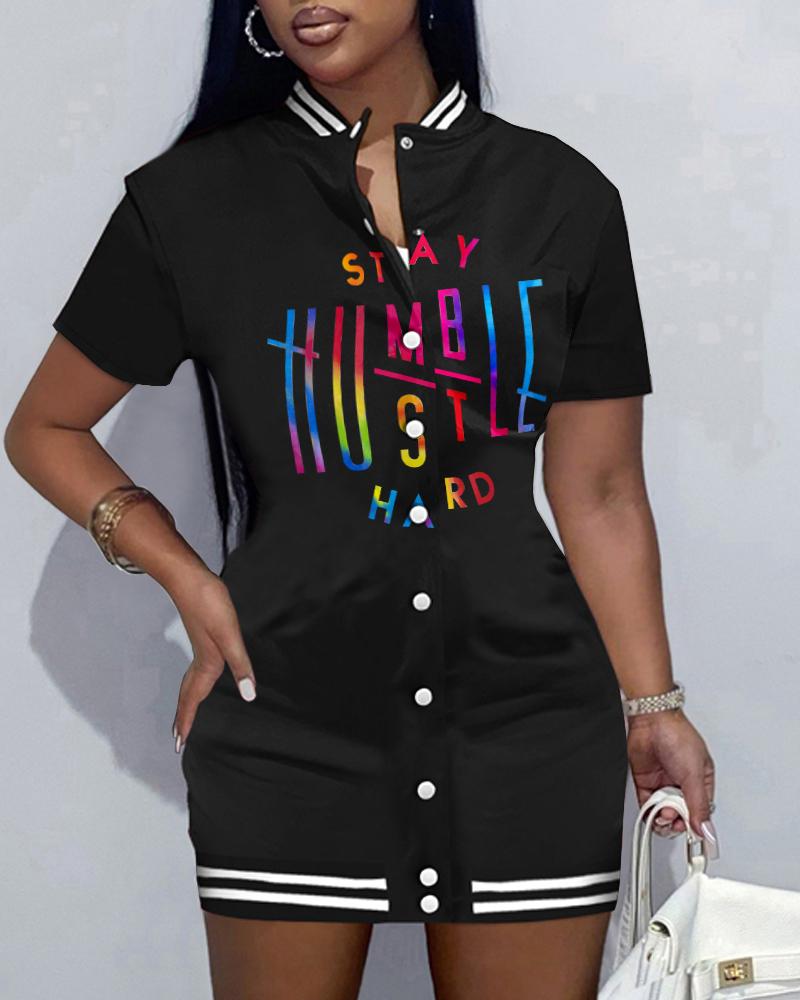 Stay Humble Hustle Hard Print Baseball Collar Casual Dress