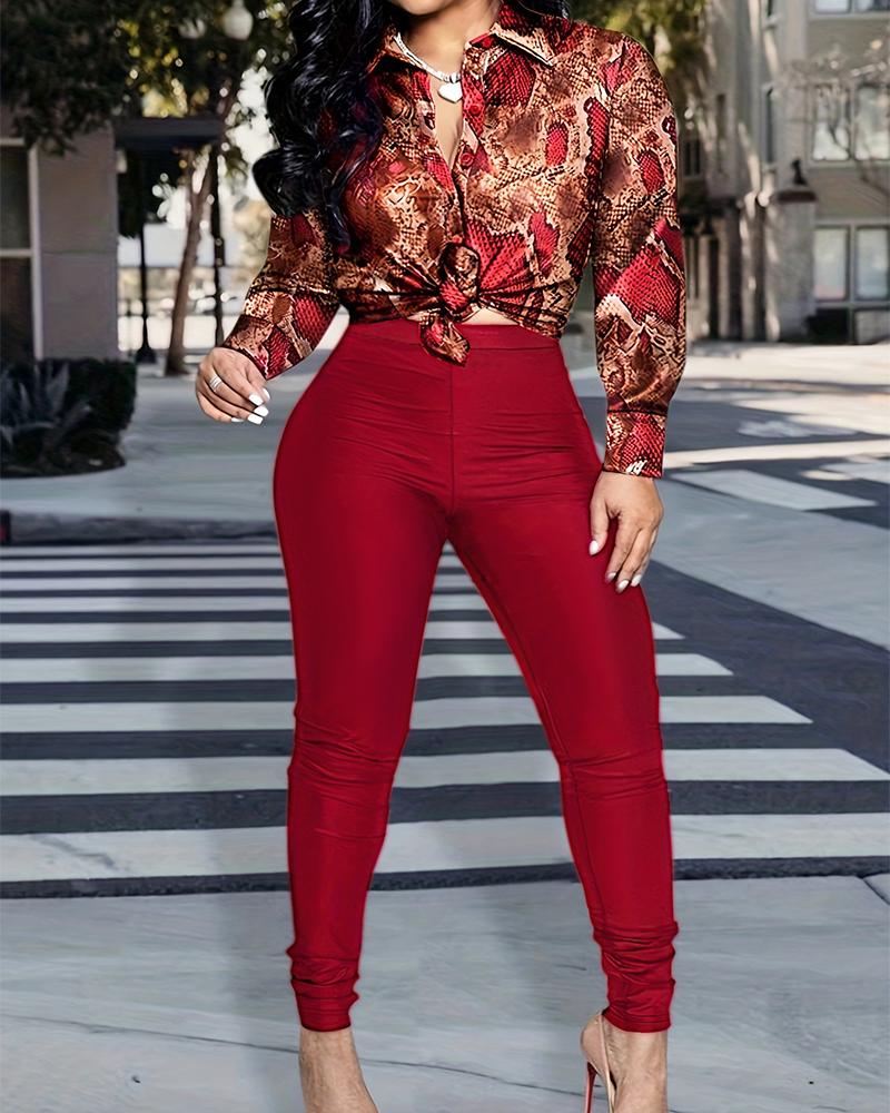 Style:Chic Type:Pants Sets Material:95%Polyester,5%Elastane Neckline:Turn-down Collar Sleeve Style:Long Sleeve Length:Long Pattern Type:Snakeskin Decoration:Button Fit Type:Regular Occasion:Daily Package Include:1*Pants Set Fabric Elasticity:Non-Stretch Sleeve Type:Regular Sleeve Sheer:No Care Instructions:Machine wash or professional dry clean