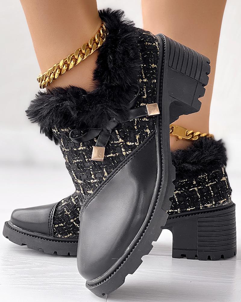 Tweed Patch Bowknot Decor Fuzzy Detail Chunky Heel Loafers