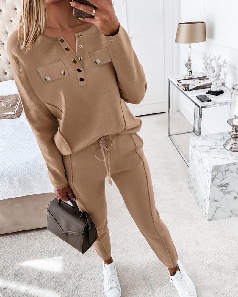 Style:Basics Type:Pants Sets Material:97%Polyester,3%Spandex Neckline:O-neck Sleeve Style:Long Sleeve Length:Long Pattern Type:Plain Decoration:Button,Drawstring,Pocket Fit Type:Regular Occasion:Daily Package Include:Pants Set