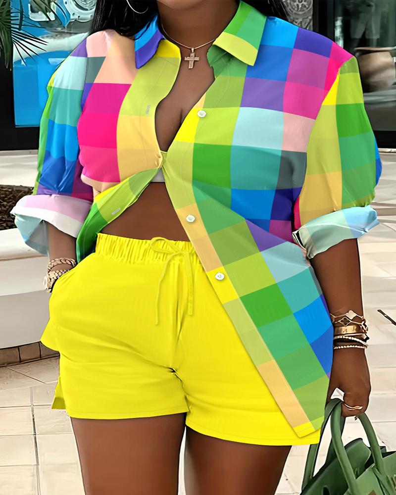 Plus Size Colorful Plaid Print Buttoned Shirt & Shorts Set