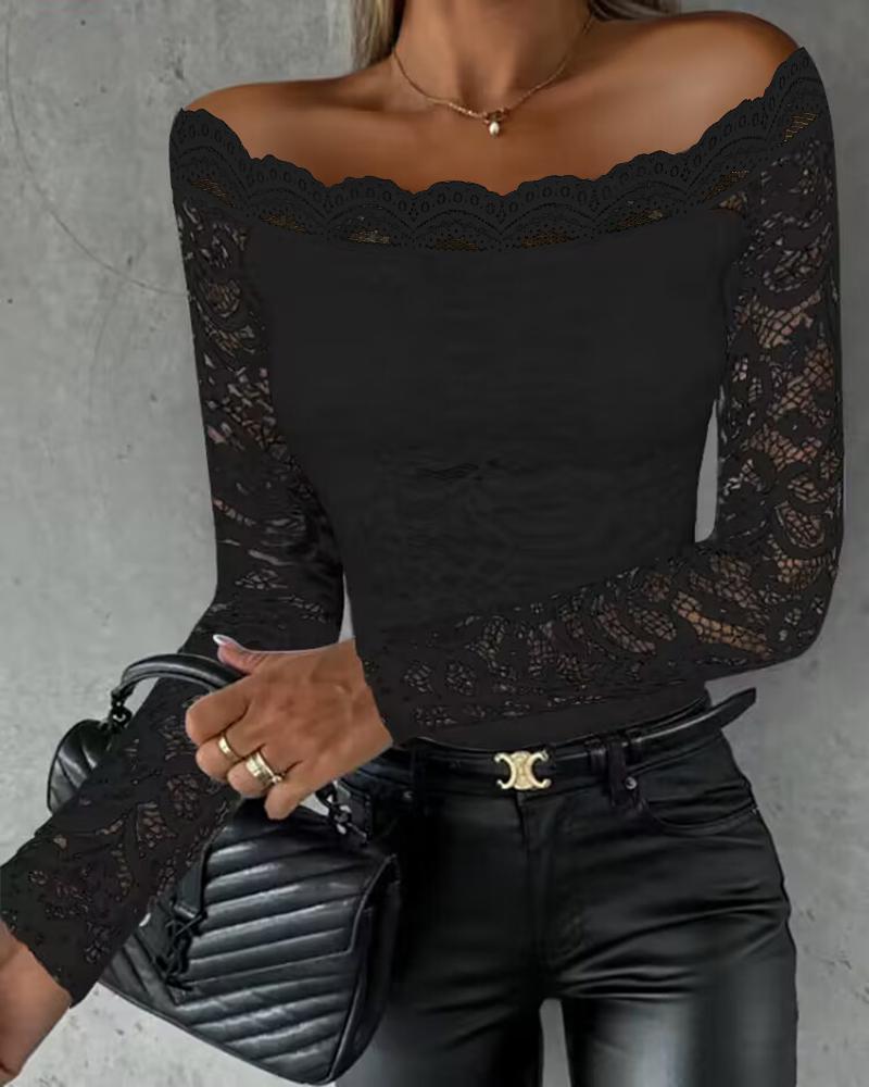 Style:Chic Type:Blouses Material:100%Polyester Neckline:Off the Shoulder Sleeve Style:Long Sleeve Length:Regular Pattern Type:Plain Decoration:Lace Fit Type:Skinny Occasion:Daily Package Include:1*Blouse Fabric Elasticity:Slight Stretch Sheer:Semi-Sheer Care Instructions:Machine wash or professional dry clean