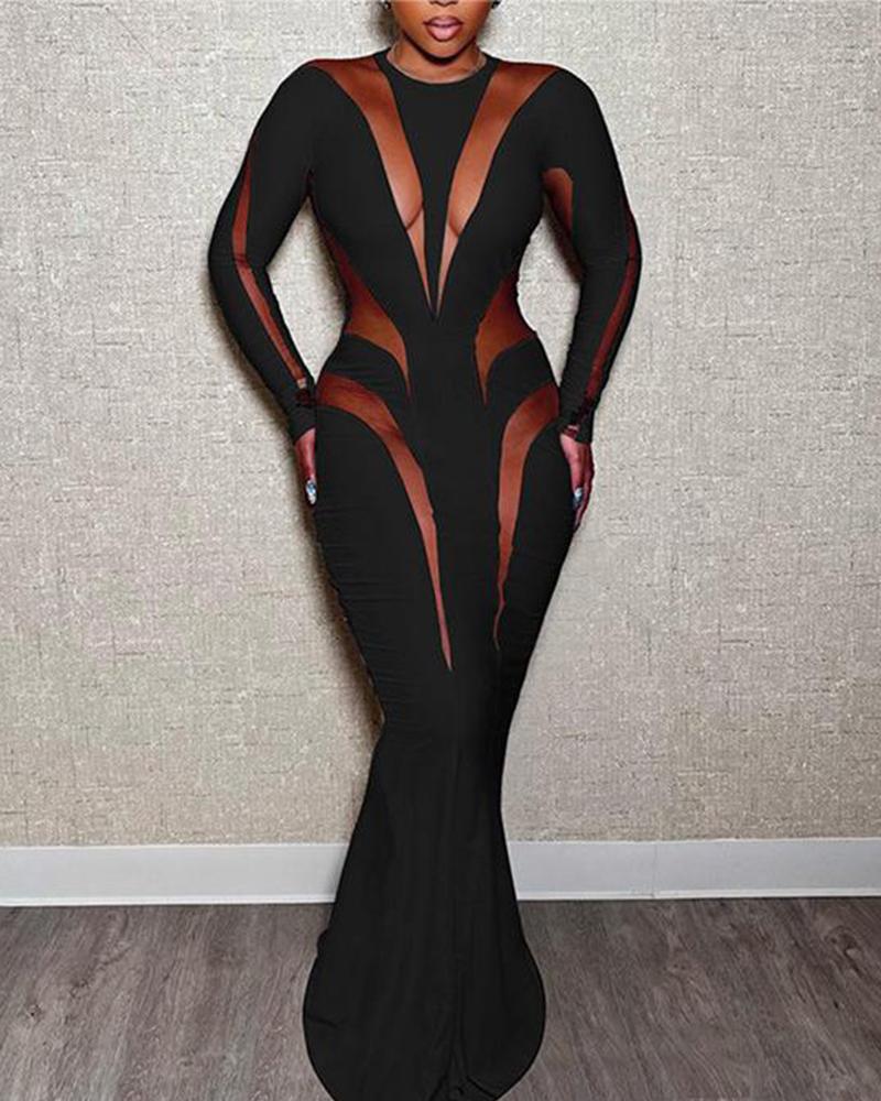 O-Neck Sheer Mesh Long Sleeve Mermaid Maxi Dress