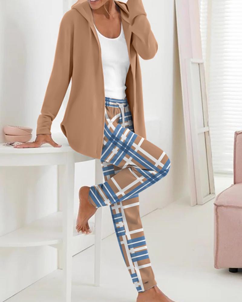 Long Sleeve Hooded Top & Plaid Print Drawstring Pants Set