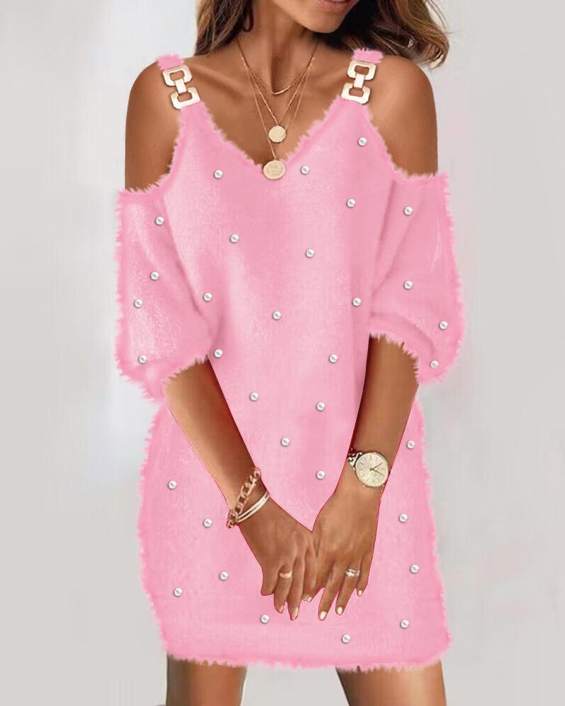 Cold Shoulder Chain Pearls Decor Fuzzy Casual Dress