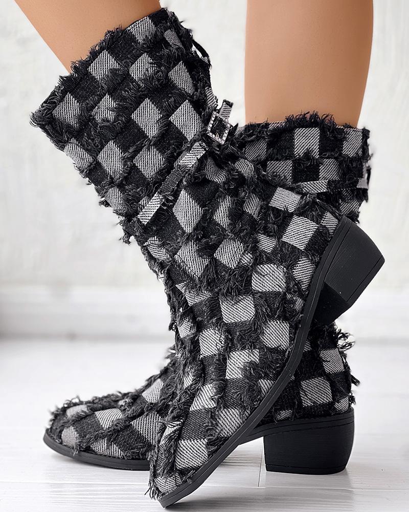 Plaid Raw Hem Chunky Heel Denim Ankle Boots
