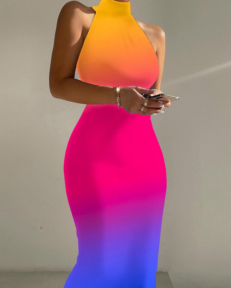 Style:Chic Type:Bodycon Material:97%Polyester,3%Spandex Neckline:High Neck Sleeve Style:Sleeveless Length:Mid-Calf Pattern Type:Ombre,Tie Dye Decoration:Others Fit Type:Skinny Occasion:Daily Package Include:1* Dress Fabric Elasticity:Slight Stretch Sheer:No Care Instructions:Machine wash or professional dry clean