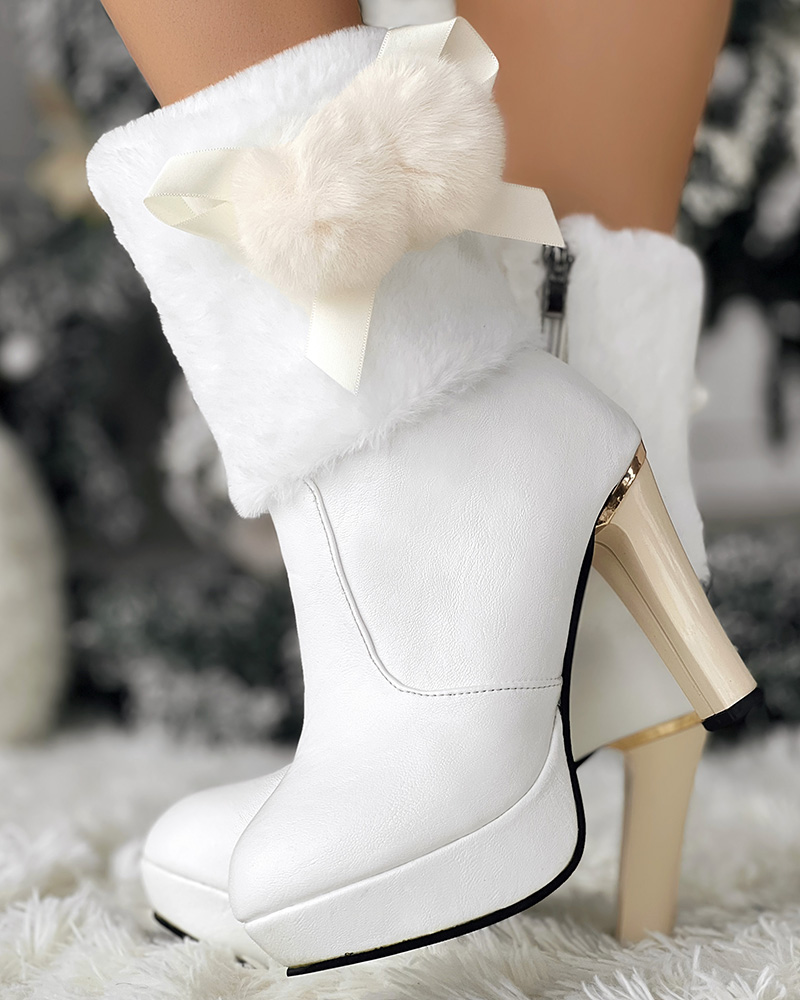 Christmas Fuzzy Detail Bowknot Design Pom Pom Lined Platform Chunky Ankle Boots