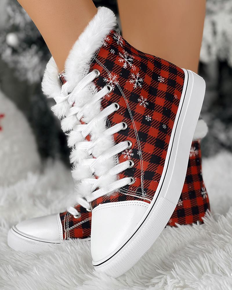 Christmas Plaid Snowflake Print Fuzzy Detail Lace-up Lined Ankle Boots