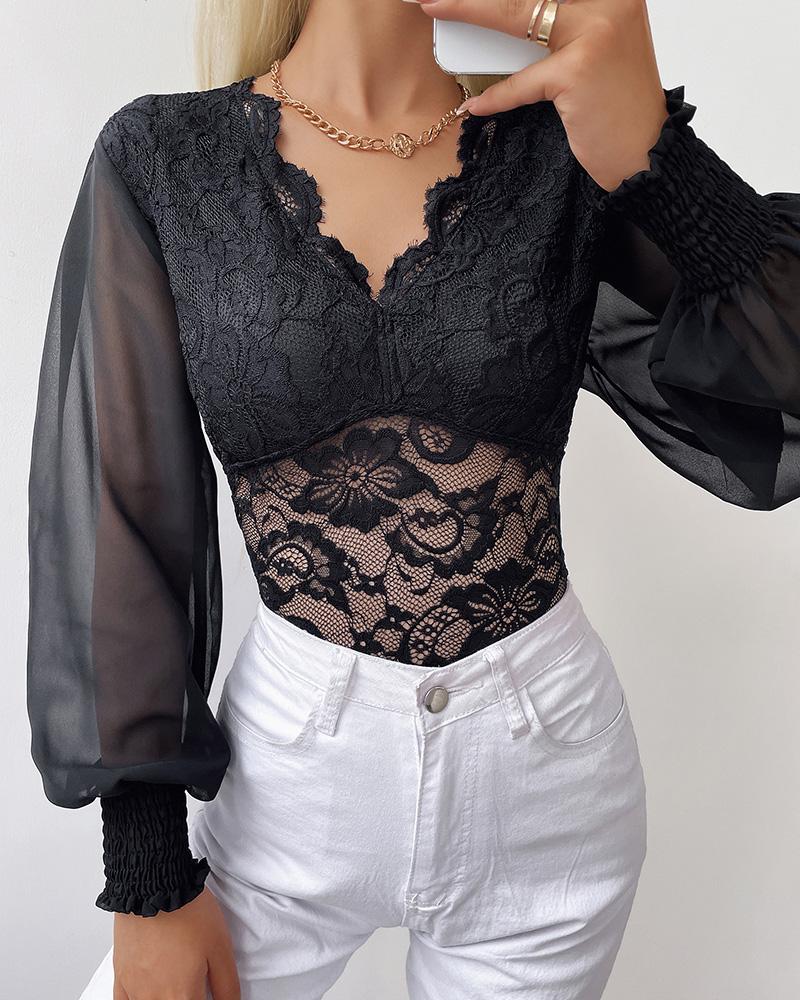 Style:Chic Type:Blouses Material:Polyester,Lace Neckline:V-Neck Sleeve Style:Lantern Sleeve Length:Regular Pattern Type:Plain Fit Type:Regular Occasion:Daily Package Include:1* Blouse