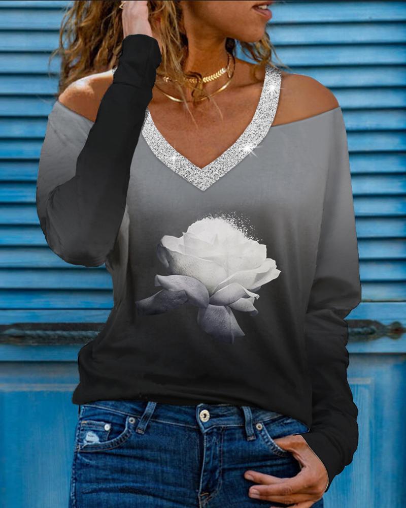 Style:Casual,Chic Type:Tee Material:95%Polyester,5%Elastane Neckline:Cold Shoulder Sleeve Style:Long Sleeve Length:Regular Pattern Type:Floral,Ombre Decoration:Cutout,Rhinestone Fit Type:Regular With Belt:No Occasion:Daily Package Include:1*T-Shirt