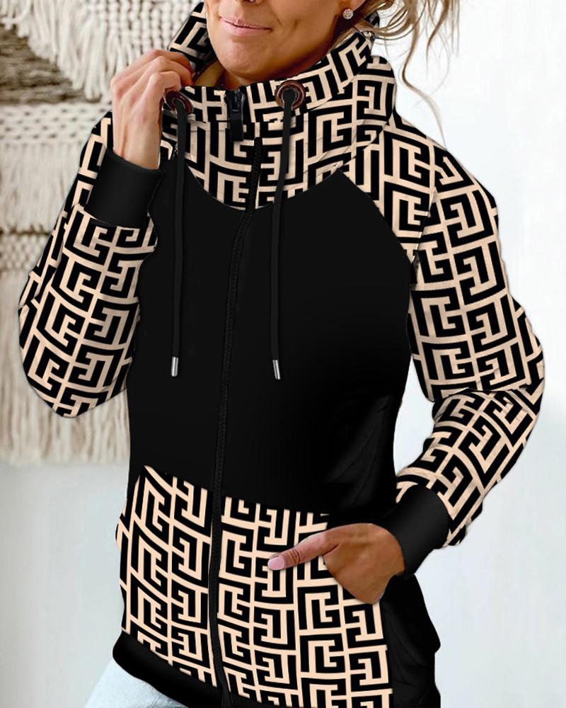 Geometric Print Zip Up Drawstring Sweatshirt
