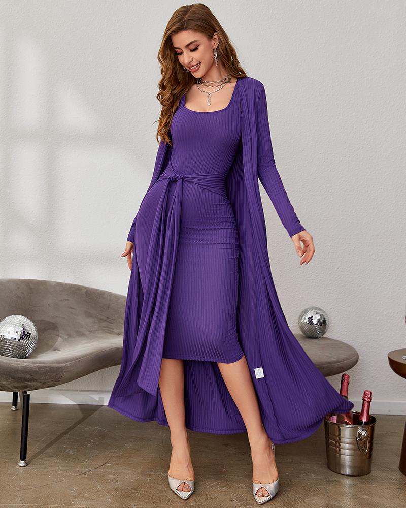 Style:Chic Type:Suit Set Material:90%Polyester,10%Elastane Neckline:U-Neck Sleeve Style:Long Sleeve,Sleeveless Length:Mid-Calf Pattern Type:Plain Decoration:Tied Detail Fit Type:Skinny Occasion:Daily Package Include:1* Dress & Coat Set Fabric Elasticity:Medium Stretch Sheer:No Care Instructions:Machine wash or professional dry clean