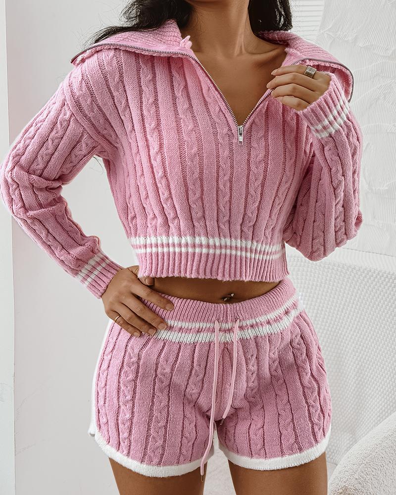 Striped Cable Knit Cardigan & Drawstring Shorts Set