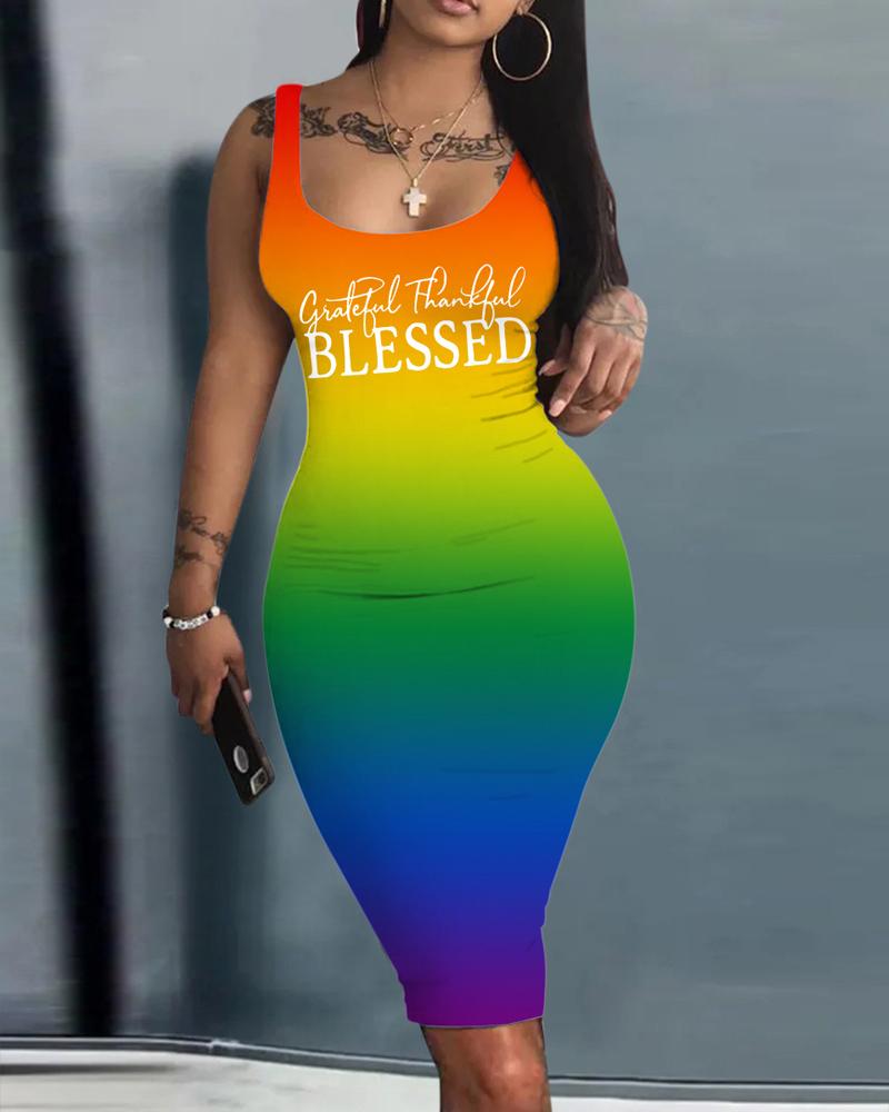 Grateful Thankful Print Ombre Sleeveless Bodycon Dress