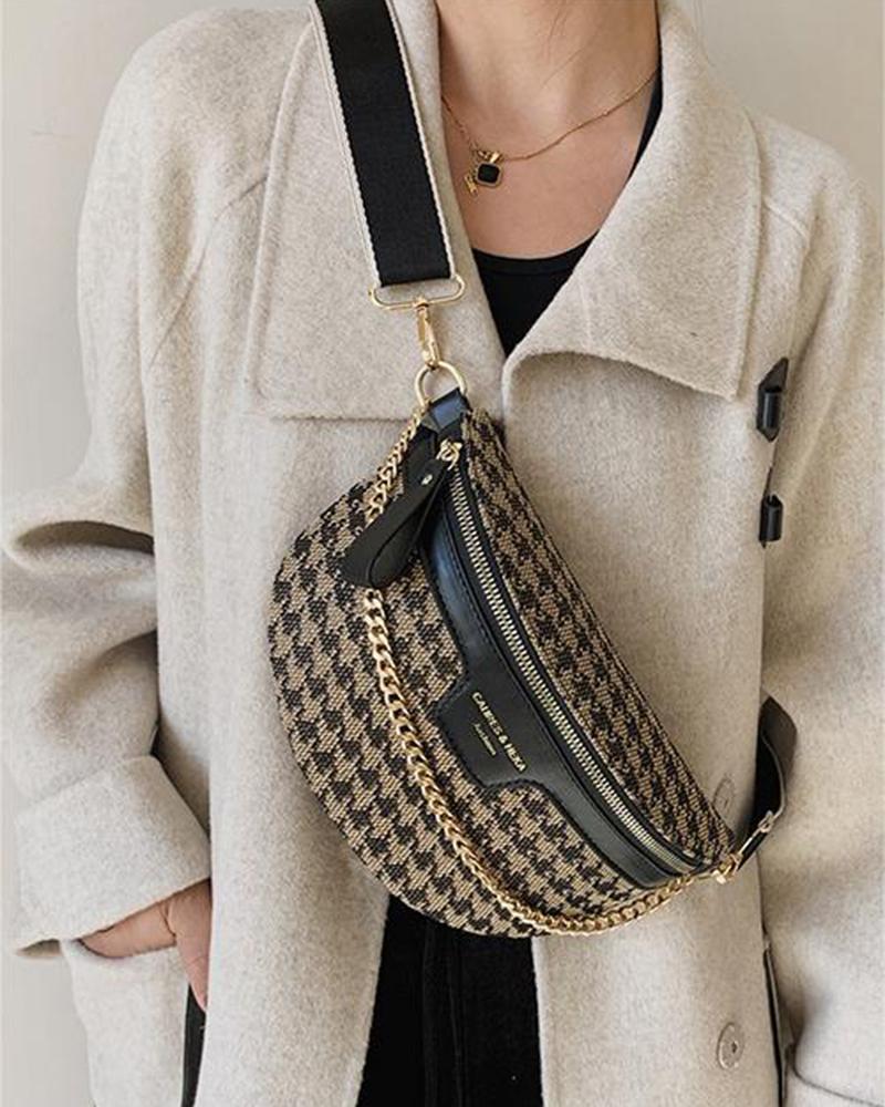 Houndstooth Leopard Fanny Pack Chain Decor Crossbody Bag
