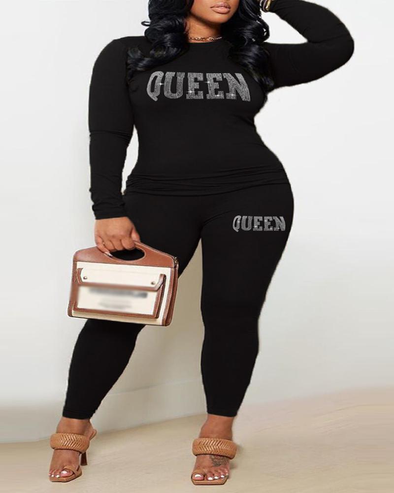 Plus Size Rhinestone Letter Pattern Casual Top & Pants Set
